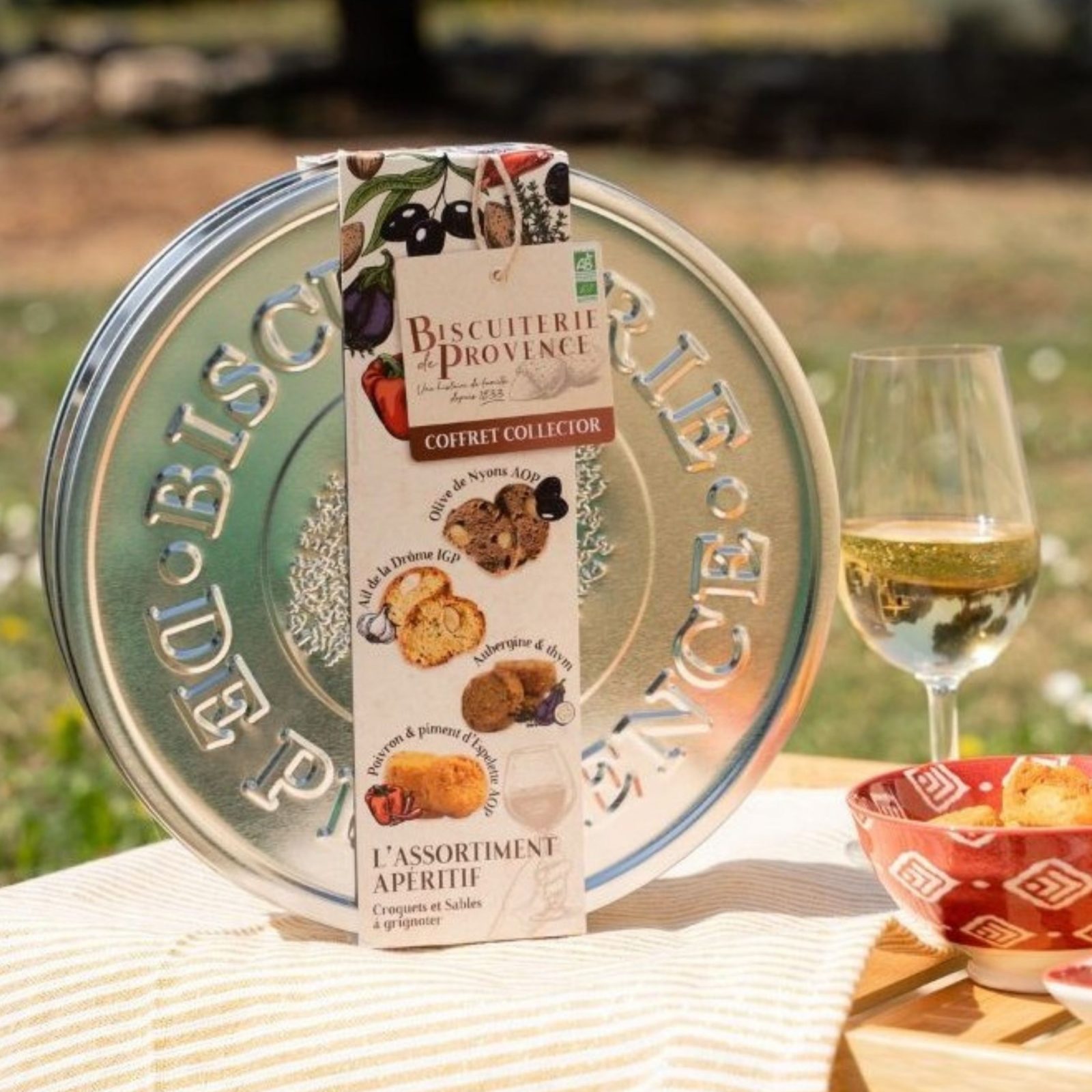 Pour tous les amoureux de la Provence et des trésors culinaires qu’elle détient, découvrez cette magnifique boîte métal regroupant nos recettes de biscuit apéritifs les plus appréciées : (Re)découvrez nos 4 recettes phares dans ce coffret cadeau prêt à offrir. Vous retrouverez le bon goût de la Provence avec ces biscuits croquants ensoleillés (et pourquoi pas le doux souvenir du chant des cigales) au moment de savourer ces spécialités à l’heure de l’apéritif !