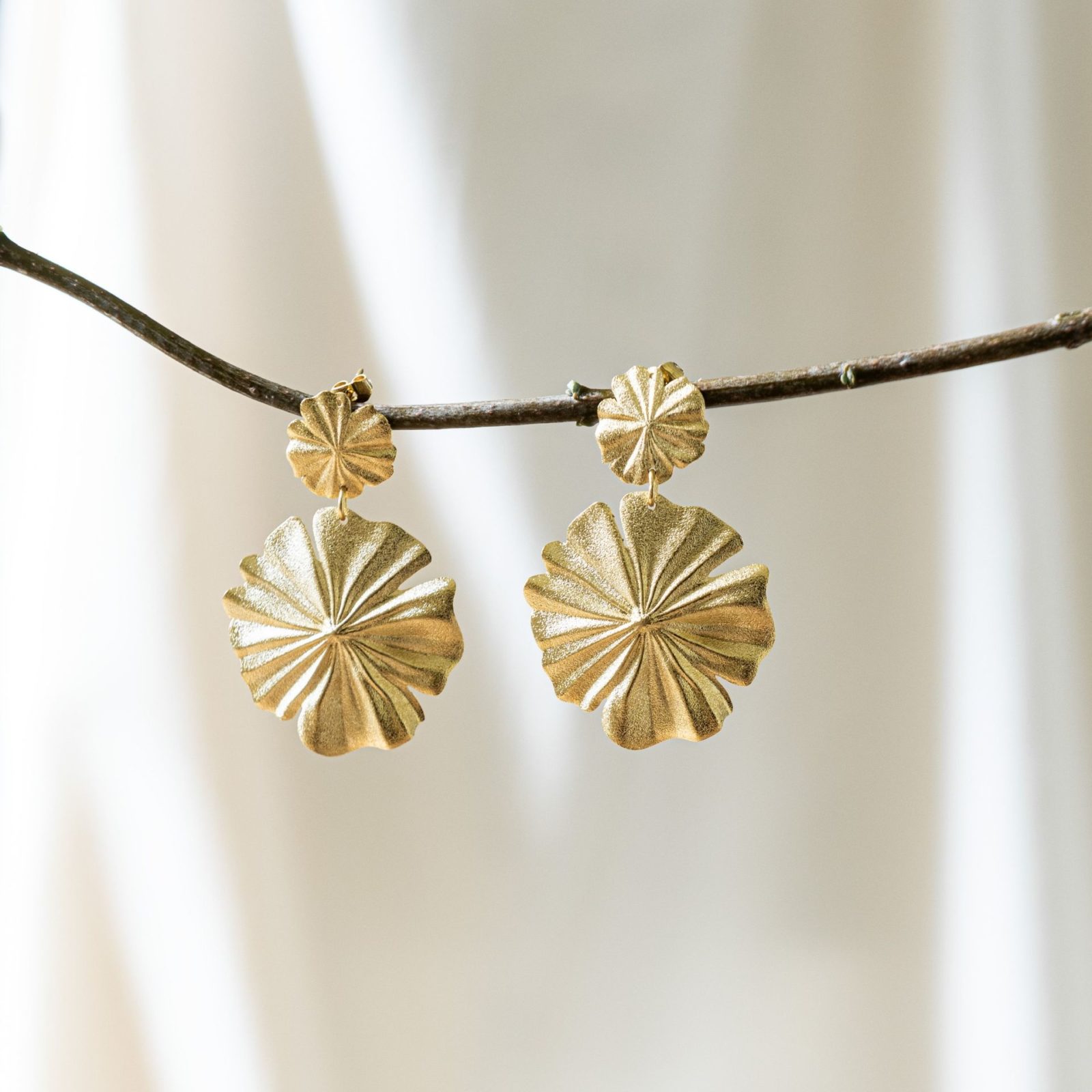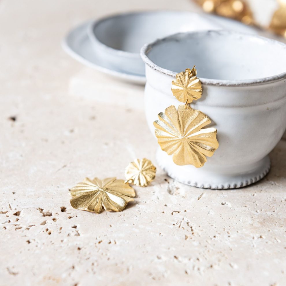 L’esprit floral de ces boucles d’oreilles évoque un « jardin des merveilles » luxuriant, inspiré de la végétation magique de Tivoli ; conçues en laiton doré à l’or fin 18 K (sans nickel), elles sont artisanales, légères (3,8 g chacune), hautes de 5 cm, avec une grande fleur de 3,5 cm et une petite de 1,5 cm, livrées dans un écrin soigné.