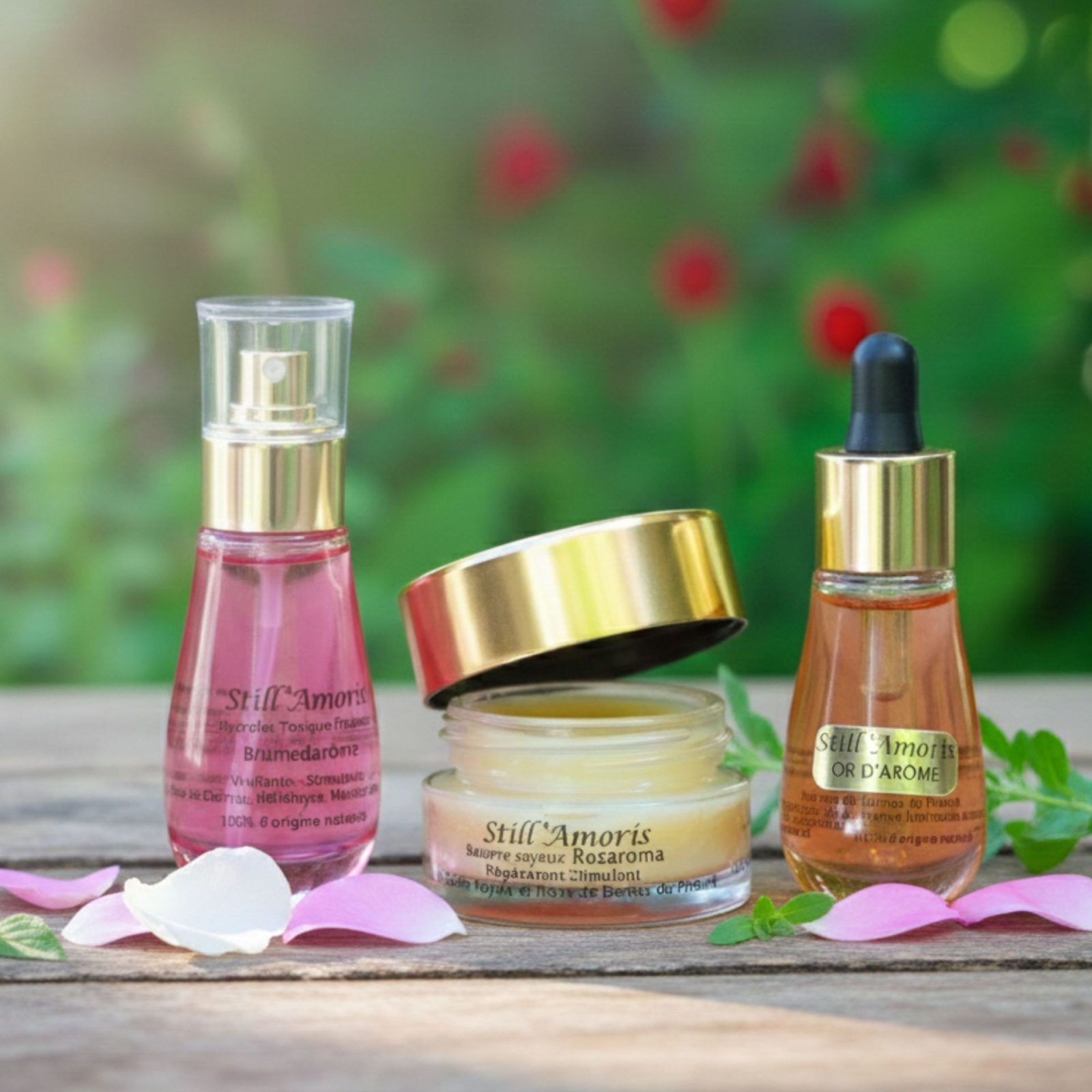 Ce coffret contient : un sérum « Or d’Arôme » (15 ml), un baume « Ros’Arôma » (15 ml) et une brume tonique « Brume d’Arôme » (50 ml).