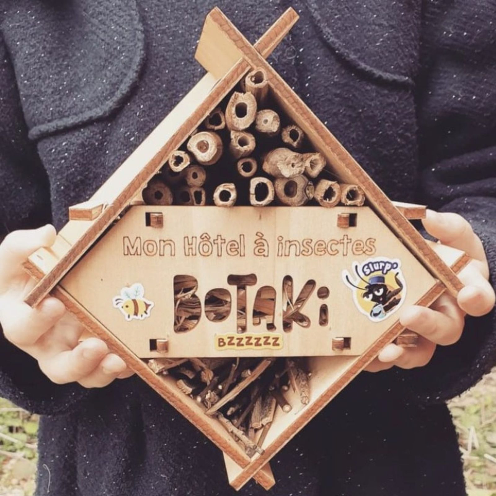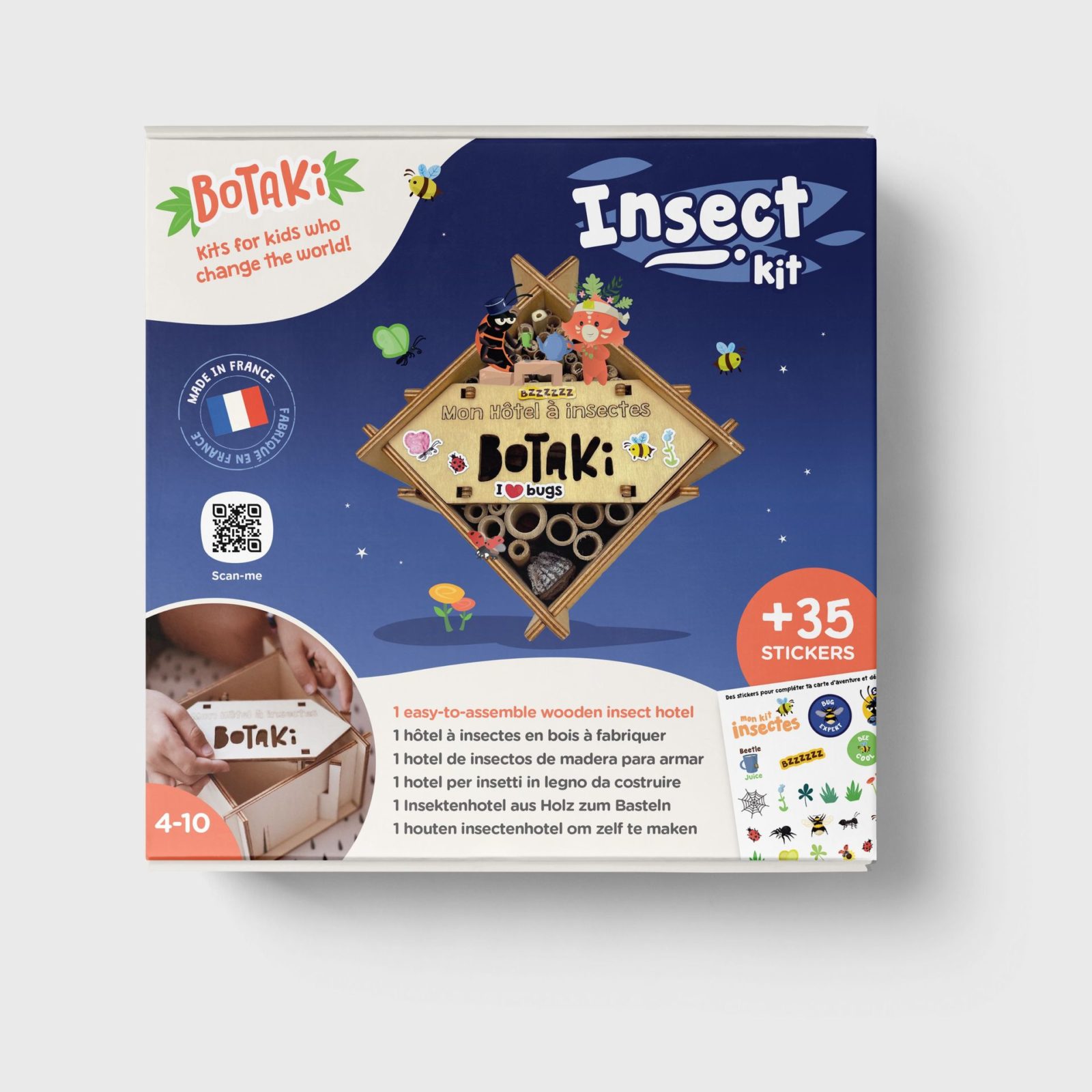 Ce kit permet aux enfants de 6 à 10 ans (dès 4 ans accompagné) de construire un hôtel à insectes en bois pour abriter les petites bêtes. Ils le garnissent d’éléments naturels et le décorent avec des stickers résistants à l’eau. Éco-conçu, fabriqué en France et assemblé en ESAT.