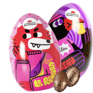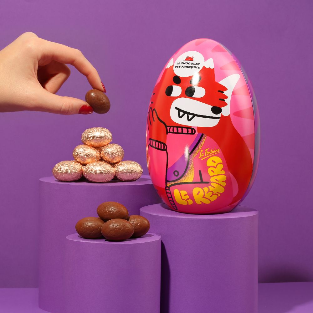 OEUF MÉTAL GARNI D’OEUFS PRALINÉ NOISETTES & CARAMEL, CHOCOLAT AU LAIT – LE CORBEAU ET LE RENARD